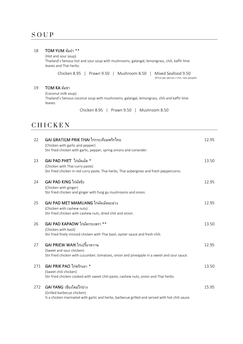 (Chicken with Thai curry paste) Stir fried chicken in red curry paste, Thai herbs, Thai aubergines and fresh peppercorns.